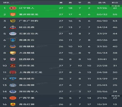 北京时间10月18日,中甲第27轮结束了5场比赛,我们一起看看最新积分榜变动,主要的信息如下:辽宁铁人3-0上海嘉定汇龙,重庆铜梁龙2-1逆转大连鲲城,广东广州豹1-0苏州东吴,延边龙鼎4-1佛山南狮、石家庄功夫1-0深圳青年人!
