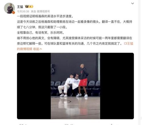 事实证明大家还是过于操心了,因为从常规赛前夕的采访来看,杨瀚森的英语进步还是相当快的。首先在最新的采访中,其实大家可以看到杨瀚森虽然和他的翻译一起站在场边,但是在翻译开口之前,杨瀚森已经能够自主听懂NBA这边外国记者的提问。大概的意思已经明白了,只是说还不能够很好的用英文来表达自己内心的想法。