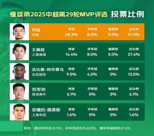 大家好,欢迎来到懂球帝2025赛季中超MVP评选现场。中超第29轮MVP得主出炉,河南队中场何超凭借一脚超级世界波,战胜了本轮同样轰出精彩进球的王燊超,收获本轮中超MVP。这是何超第一次进入中超MVP候选,就直接获评当选。