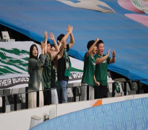 题图说明:上海U20全运男足队员在晋级八强后,特别感谢现场观赛助威的球迷。